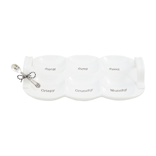 The Circa Snack Tray Set offers a hassle-free snacking experience with its convenient 2-piece design. It features a six-sectioned snack tray with dimensional side handles for easy carrying. The set also includes a stamped silverplate spoon, ensuring effortless serving. Crafted from durable and dishwasher safe ceramic, cleaning up is a breeze. Plus, you can conveniently heat up your snacks in the microwave without any worries. Made from stylish and functional dolomite, this snack tray set is a must-have addition to your kitchen.