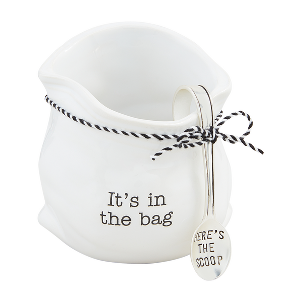 The Candy Bag With Scoop 2-piece set is a delightful and useful addition to your kitchen or dining space. This set features a ceramic candy bag shaped dish, ideal for storing all your beloved sugary delights. It also comes with a silverplate spoon with a stamped design, making it effortless to scoop out just the right amount of candy. The ceramic material is dishwasher safe, ensuring effortless cleaning after each use. Moreover, it is microwave safe, allowing you to easily warm up any candies that require a bit of extra heat. Crafted from durable dolomite, this set is not only practical but also built to last.