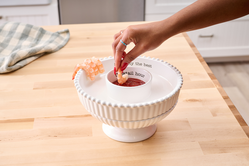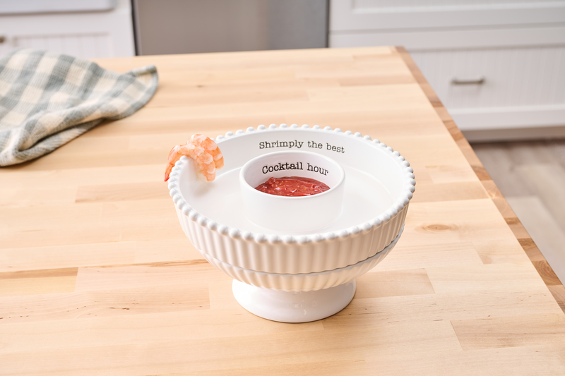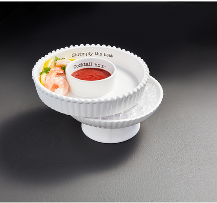 The Shrimp Cocktail Chiller Set is a practical set consisting of a textured ceramic pedestal and a dip tray. The pedestal is specifically crafted to hold ice, ensuring that the shrimp and dip tray remain chilled for extended durations. Constructed from durable dolomite ceramic, this set is both dishwasher and microwave safe, allowing for effortless cleaning and reheating of your beloved shrimp cocktail.