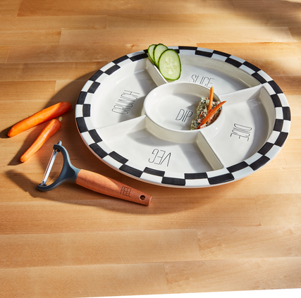 The Bistro Veggie Platter 2-piece set is a chic and practical addition to any kitchen or dining table. Crafted from hand-painted ceramic, this crudité platter is not only visually appealing but also built to last. The set includes a plastic and wood peeler, making it convenient for prepping a variety of vegetables. The ceramic material used in this platter is dishwasher and microwave safe, ensuring easy cleaning and versatility. Constructed with dolomite, this platter is sturdy and resistant to chipping or breaking. Whether you're hosting a dinner party or enjoying a meal with your family, the Bistro Veggie Platter 2-piece set is a versatile and essential choice. Its elegant design and functionality make it a must-have for any food enthusiast or host.
