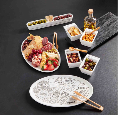 Spread, crunch and munch your way through this Charcuterie Ceramic Platter Set. The two piece set comes with a ceramic platter. The cheese platter features sections for meat, cheese, crackers, fruit, olives, jam and more. The cheese platter comes with wooden tongs.