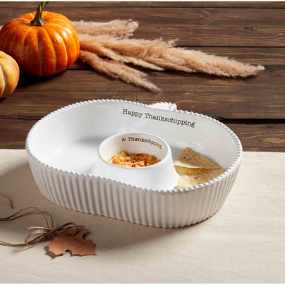 Celebrate Thanksgiving in style with our Pumpkin Chip and Dip Set. This carefully crafted set includes a ceramic dip dish with a delightful fluted design and a charming pumpkin-shaped chip bowl. The highlight of this set is the integral center dip that allows for easy serving and sharing. The chip bowl features the cheerful phrase "Happy Thankschipping," while the dip bowl reads "Thanksdipping." Made of durable dolomite, these dishes are not only visually appealing but also dishwasher safe for effortless cleaning. Measuring 12" x 9 1/5" for the dish and 4" for the dip bowl, our Pumpkin Chip and Dip Set is the perfect addition to your Thanksgiving table.