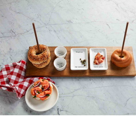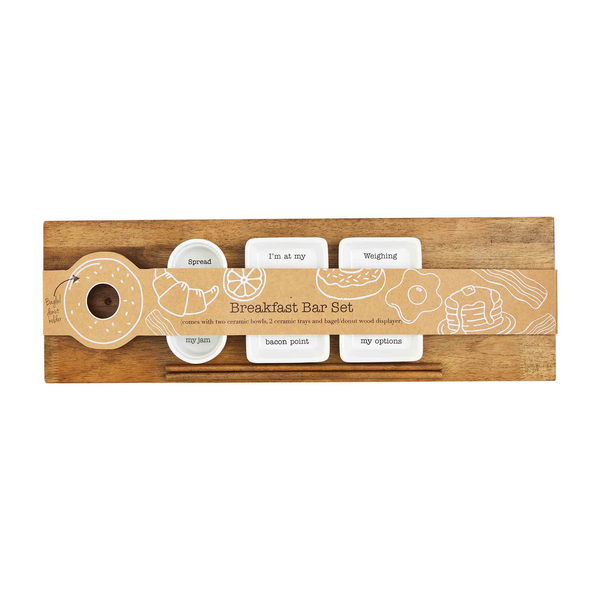 Discover the Breakfast Bar Set - an essential addition to your kitchen! This five-piece set includes a stylish wooden serving board with removable dowels, perfect for showcasing and organizing your favorite bagels and doughnuts. Accompanied by two ceramic serving dishes and two charming ramekins, this set adds a touch of whimsy to your dining experience. The ceramic dishes feature delightful phrases like "Weighing my options" and "I'm at my bacon point," while the ramekins playfully declare "Spread it on thick" and "That's my jam." With a board measuring 22" x 8", dowels measuring 12" x 1/4", dishes measuring 3 1/2" x 5 1/4", and ramekins measuring 2 1/4" in diameter, this versatile set is perfect for various occasions, including baby showers and bridal showers. Crafted from durable dolomite, the ceramic components are also dishwasher safe, ensuring easy cleanup and long-lasting enjoyment.