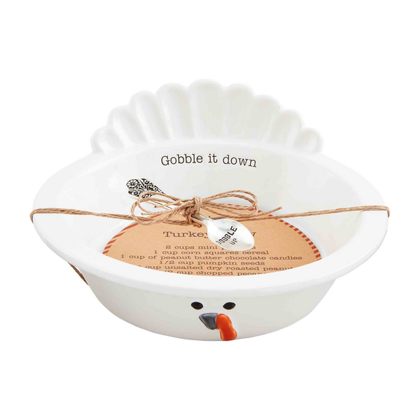 Gobble it down with our Turkey Chow Bowl Set! This two-piece set includes a beautifully hand-painted ceramic bowl, designed with a delightful textured finish. Measuring 7 3/4" x 3 1/2", the bowl is adorned with the charming phrase "Gobble it down." The set also includes a silver-plate spoon with a length of 3 1/2", featuring the playful inscription "Gobble up." For added convenience, the bowl is dishwasher safe, ensuring easy cleanup. Plus, you'll receive a kraft card with a delectable recipe for "Turkey Chow" snack mix. Make every meal a delightful experience with our Turkey Chow Bowl Set.