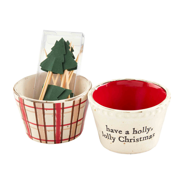 Celebrate the Christmas season with our Holly Jolly Tidbit Set, designed to elevate your holiday gatherings. The set includes two charming stoneware tidbit ramekins adorned with delightful hand-painted details. Accompanied by a pack of holiday-themed toothpicks, this set is perfect for serving delectable appetizers. Easy to clean, the dishwasher-safe ramekins are both functional and festive. Each ramekin measures 3" x 2", while the toothpicks showcase a lovely cardinal image, adding a touch of merriment to your table. Make your Christmas merrier with this Tidbit Set, the ideal addition to your seasonal tableware collection.