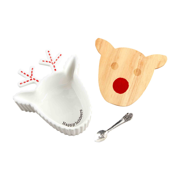 Get into the holiday spirit with our Reindeer Candy Tidbit Dish, designed to add a festive touch to your celebrations. This delightful set includes a hand-painted ceramic candy dish with an engraved wood lid. Measuring 5 3/4" x 6 1/2", the dish showcases the playful phrase "Oh snap" on its interior, while boasting a convenient 2" height. Accompanying the dish is a stamped silver-plate spoon measuring 3 1/2", featuring the charming inscription "Happy holideers". Enjoy the ease of cleaning as the ceramic dish is dishwasher safe.