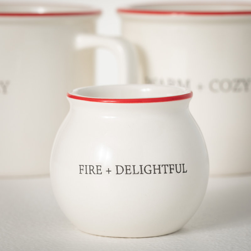 White & red mug set featuring holiday text will add extra cheer to your holiday festivities