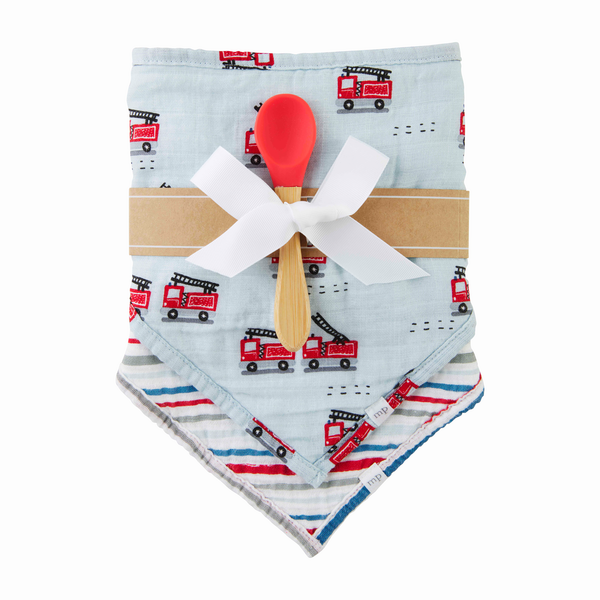 You'll love this golf muslin bib set from our muslin collection. The three piece set comes with two muslin bibs. The bibs each feature detailed print patterns. Both bibs feature unique golf-themed images. The set also comes with a coordinating gray wood and silicone spoon.