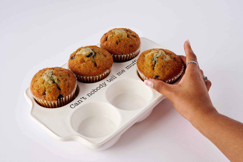 You can't tell me muffin when it comes to this Muffin Tray and Spatula Set. The two piece set comes with a ceramic muffin tray. The tray features the sentiment "can't nobody tell me muffin". The set also comes with a wood and silicone spatula. The spatula features the sentiment "stud muffin".