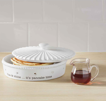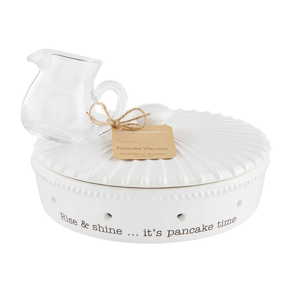 Rise and shine, it's Pancake time with our Pancake Warmer Set. The three piece set comes with a beaded ceramic pancake warming dish. The dish comes with a lid. The dish reads "Rise & Shine... It's pancake time". The pancake warmer comes with a glass syrup pitcher attached.