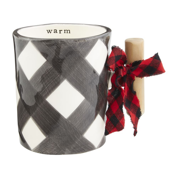 Get ready for warm and cozy nights in this winter with our black buffalo plaid oversized mug. The oversized ceramic mug features a driftwood handle. The coffee mug features a hand-painted design that showcases a black and white plaid pattern. The interior of the mug says "warm".