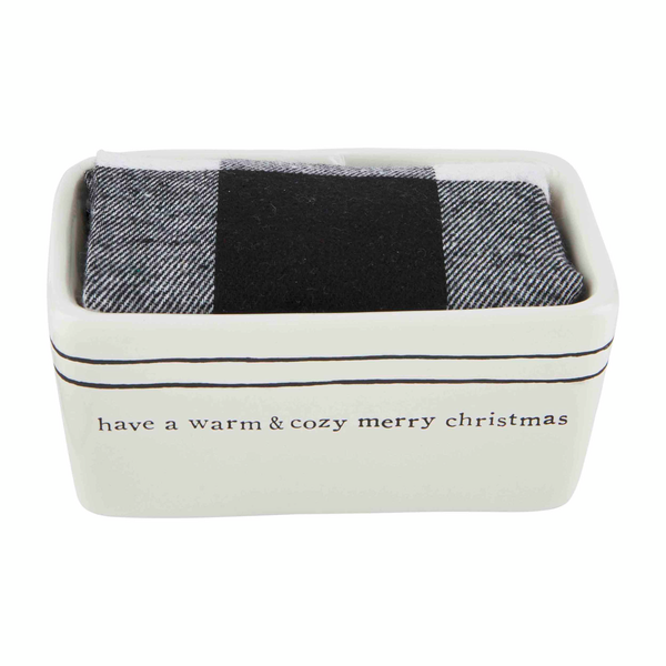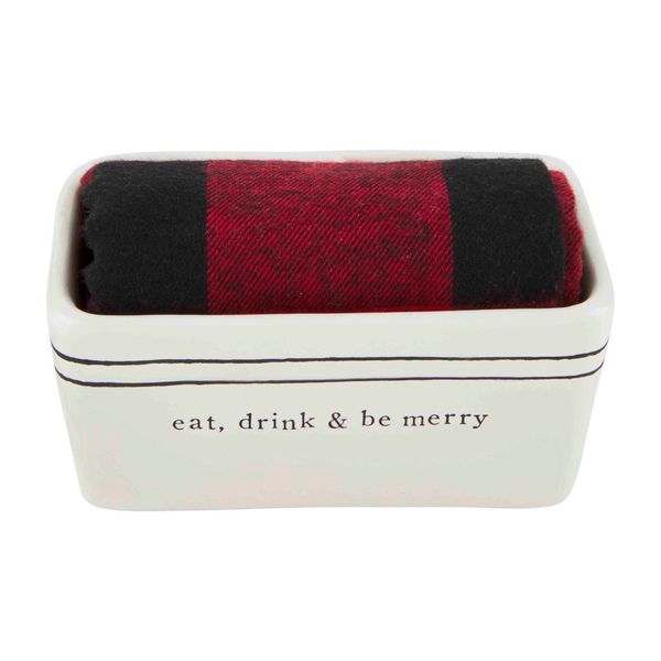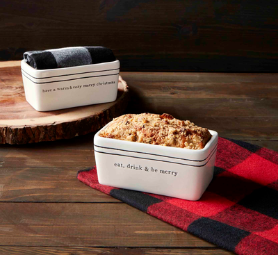Tis the season for Christmas baking with our Be Merry Christmas Mini Loaf Set. The two piece set comes with our ceramic mini loaf dish. The dish features the sentiment "eat, drink and be merry". The mini loaf dish comes with a cotton towel that features a red and black plaid pattern.