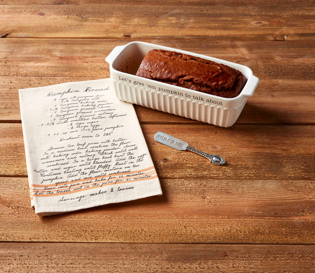 Let's give 'em pumpkin to talk about with our Pumpkin Bread Baker and Towel Set. The three piece set comes with a fluted ceramic baking dish. The dish comes with a stamped silver-plate spreader and cotton recipe towel for Pumpkin Bread. The dish reads "Let's give 'em pumpkin to talk about".