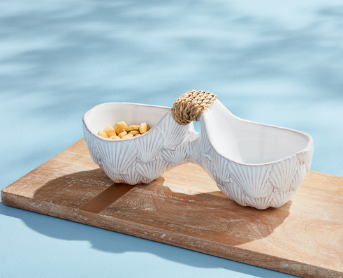 The Sea Double Serving Dish is a magnificent milk glazed terracotta double dip dish that will enhance any table setting. Its design is one-of-a-kind, with a center handle wrapped in rattan, giving it an elegant touch. Crafted from top-notch terracotta, this dish is not only visually appealing but also long-lasting. It is ideal for serving dips, sauces, or small appetizers. Whether you're throwing a dinner party or having a relaxed meal, this double serving dish is an essential addition to your kitchenware collection.