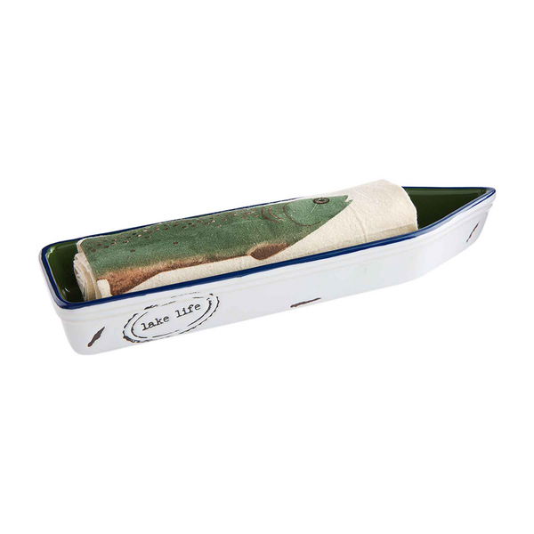 Soak up the sun with lake snacks in our Lake Life Cracker Dish Set. The two piece set comes with a hand-painted stoneware boat shaped cracker dish. The dish features a debossed "stamp" detail that reads "lake life". The dish comes with a flour sack hand towel that reads "gone fishin".