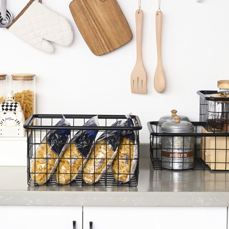 Featuring 2 convenient side handles, our pantry storage baskets are designed for easy portability. You can effortlessly carry or move them to any location you desire. The open wire design allows for quick visibility of the basket's contents, making it a breeze to find what you need. With these baskets, you can keep your items neatly organized in one place, saving both time and storage space.
