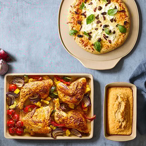 Our unglazed stoneware is made with our new StoneFusion material making it our strongest and most durable stoneware yet. You can pre-heat, broil, and even put it in the dishwasher. Each piece features a ribbon pattern, so you can easily distinguish it from your original unglazed stones. Like all our stones, you can use it to make your favorite baked goods, frozen foods, or reheated leftovers that are just as good or better than day one. And it only gets better with age. A nonstick seasoning will develop as you use it—the darker it looks, the better it cooks!