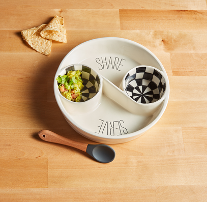 The Bistro Double Chip and Dip 2-piece set is a must-have for any dining or entertaining space. Its stylish and functional design makes it the perfect addition to your table. This set includes a hand-painted four-sectioned server, allowing you to serve a variety of snacks or appetizers with ease. The set also comes with a wood and silicone spoon, providing convenience and versatility. Made from high-quality dolomite ceramic, this set is not only durable but also dishwasher safe, making clean-up a breeze. You can also safely heat up dips or sauces in the microwave without having to transfer them to another container. Whether you're hosting a party, having a family gathering, or simply enjoying a casual night in, the Bistro Double Chip and Dip set is ideal. Impress your guests and elevate your dining experience with this elegant and practical set. It's perfect for serving chips and salsa, veggies and dip, or any other combination you can think of.