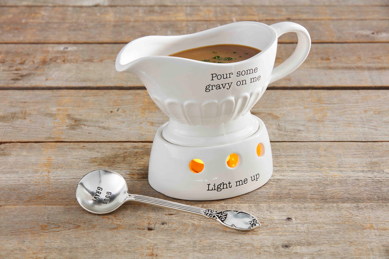 Pour some gravy on me with this Gravy Boat Warming Set. The four piece set comes with a ceramic gravy boat. The boat comes with a ceramic warming base, tea light and stamped silver-plate spoon. The center of the gravy boat features the sentiment "pour some gravy on me".