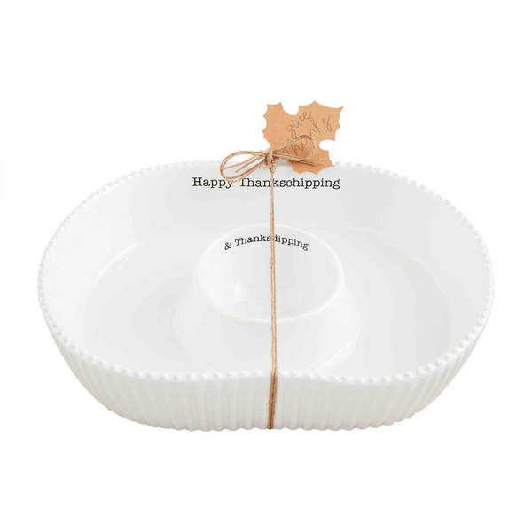 Celebrate Thanksgiving in style with our Pumpkin Chip and Dip Set. This carefully crafted set includes a ceramic dip dish with a delightful fluted design and a charming pumpkin-shaped chip bowl. The highlight of this set is the integral center dip that allows for easy serving and sharing. The chip bowl features the cheerful phrase "Happy Thankschipping," while the dip bowl reads "Thanksdipping." Made of durable dolomite, these dishes are not only visually appealing but also dishwasher safe for effortless cleaning. Measuring 12" x 9 1/5" for the dish and 4" for the dip bowl, our Pumpkin Chip and Dip Set is the perfect addition to your Thanksgiving table.