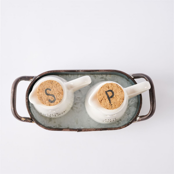 Add charming fun to your table top with this clever mini pitcher shaped salt and pepper shakers, featuring debossed NOT SALT and NOT PEPPER sentiment exteriors, and comes complete with cork stoppers. This 5-piece set includes a distressed metal caddy for the shakers to rest within.