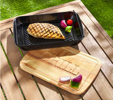 Your favorite grill master needs this Marinating Prep Tray. The melamine marinating tray comes with a wood lid. The lid doubles as a cutting board for slicing and serving food for the grill. The top of the lid features the sentiment "Grill". This makes a perfect gift set for dads!