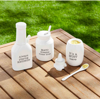 Our Ceramic Mayo Holder is a must have for backyard barbeque. The two piece set comes with a ceramic condiment bottle shaped container with a lid. The condiment bottle comes with a spoon. The condiment bottle features the sentiment "Mayo dreams come true" on the front.