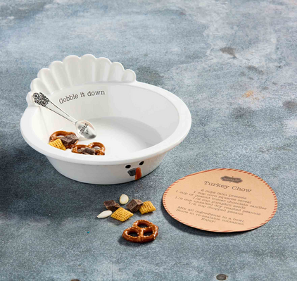 Gobble it down with our Turkey Chow Bowl Set! This two-piece set includes a beautifully hand-painted ceramic bowl, designed with a delightful textured finish. Measuring 7 3/4" x 3 1/2", the bowl is adorned with the charming phrase "Gobble it down." The set also includes a silver-plate spoon with a length of 3 1/2", featuring the playful inscription "Gobble up." For added convenience, the bowl is dishwasher safe, ensuring easy cleanup. Plus, you'll receive a kraft card with a delectable recipe for "Turkey Chow" snack mix. Make every meal a delightful experience with our Turkey Chow Bowl Set.