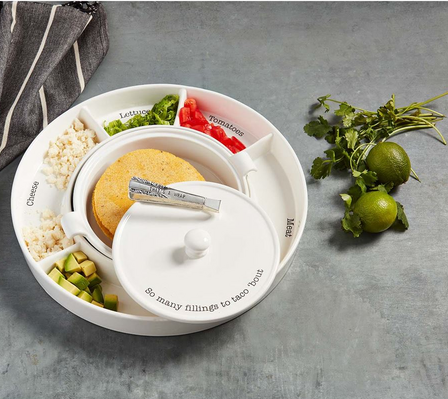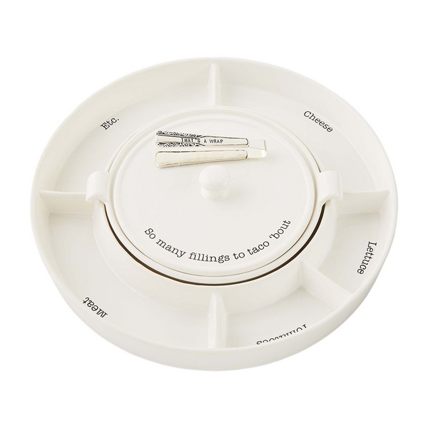 Create an entire taco bar in one server with our Taco Bar serving tray set. The three piece set comes with a removable lidded tortilla warmer that sits in center of five taco topping servers. The top of the tortilla warmer reads "So many fillings to taco 'bout". There are sections for lettuce, cheese, tomatoes, meat and etc. The set comes with silver-plate tongs that read "That's a wrap".
