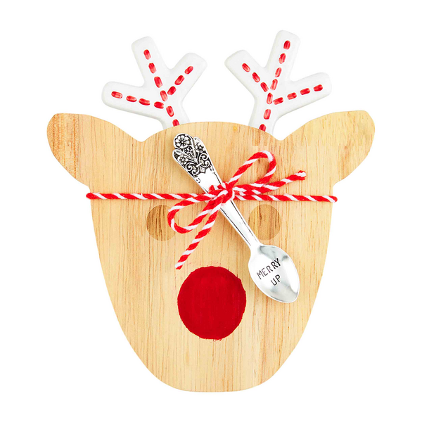 Get into the holiday spirit with our Reindeer Candy Tidbit Dish, designed to add a festive touch to your celebrations. This delightful set includes a hand-painted ceramic candy dish with an engraved wood lid. Measuring 5 3/4" x 6 1/2", the dish showcases the playful phrase "Oh snap" on its interior, while boasting a convenient 2" height. Accompanying the dish is a stamped silver-plate spoon measuring 3 1/2", featuring the charming inscription "Happy holideers". Enjoy the ease of cleaning as the ceramic dish is dishwasher safe.