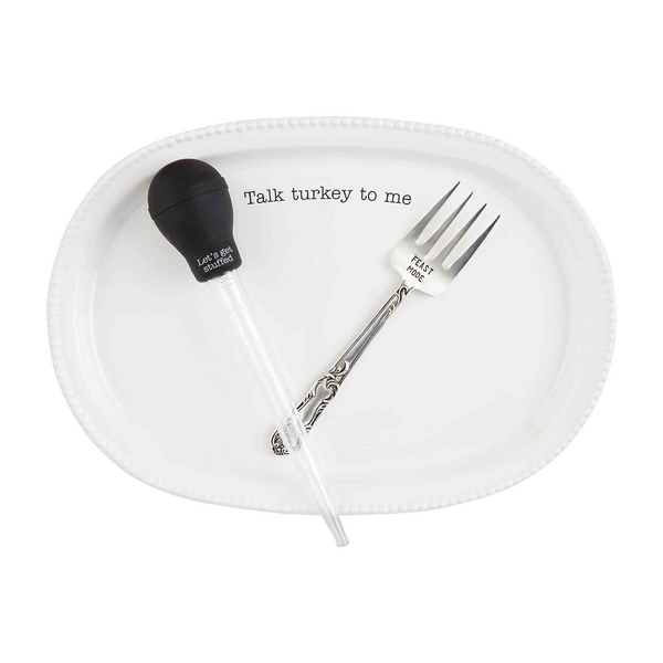 Our Talk Turkey To Me Turkey Platter Set is designed to add a touch of charm to your Thanksgiving table. This two-piece set includes a beautifully crafted beaded ceramic platter, a silicone turkey baster, and a stamped silver-plate fork. Perfect for hosting a festive feast, this set is sure to impress your guests. The platter showcases the sentiment "Talk turkey to me," while the baster features the playful phrase "Let's get stuffed." Get into the festive spirit with the sentiment "feast mode" engraved on the fork. With its dishwasher-safe ceramic material, cleaning up after your meal becomes a breeze.