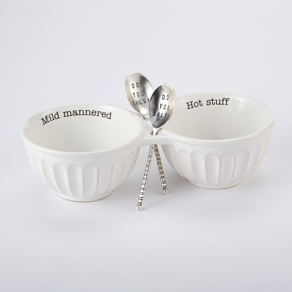 Do you salsa? Our three piece Salsa Double Dip Bowl set does. The ceramic bowls feature the sentiments "Mild mannered" and "Hot stuff". The salsa double dip cup set arrives with two "DO YOU SALSA" silverplate spoons. The spoon rest cut outs in bowls are perfect for spoon storage.