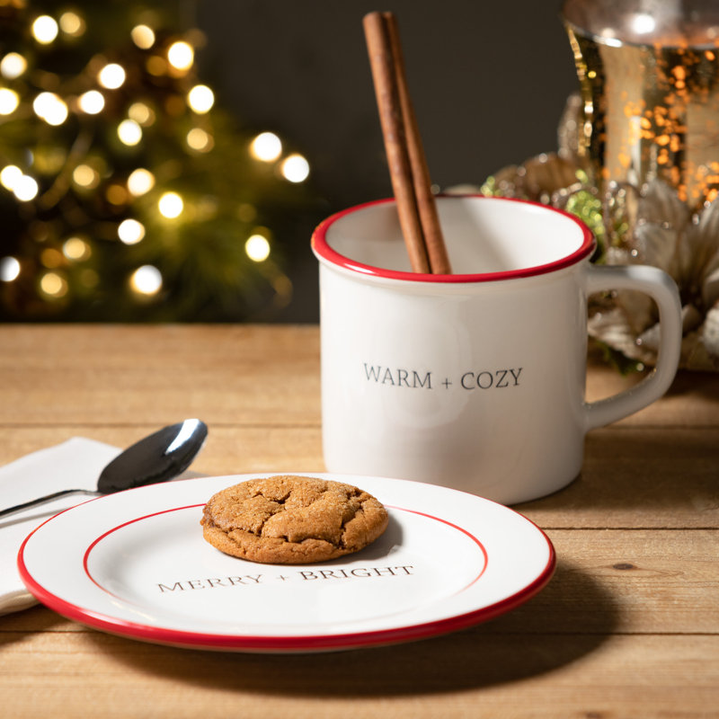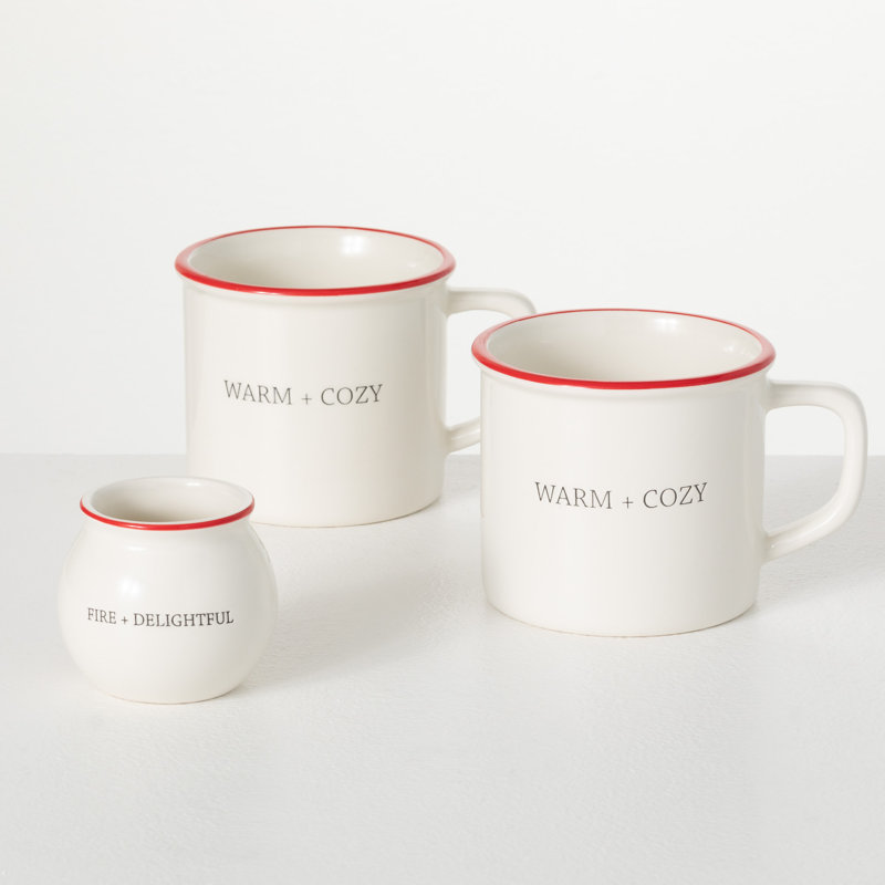 White & red mug set featuring holiday text will add extra cheer to your holiday festivities