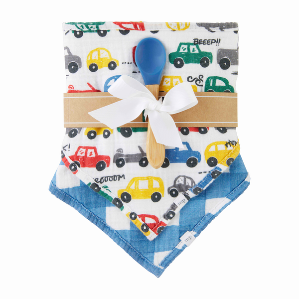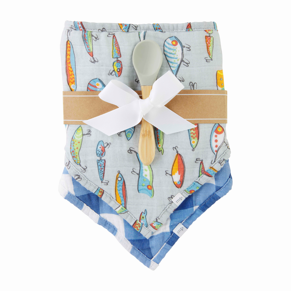 You'll love this golf muslin bib set from our muslin collection. The three piece set comes with two muslin bibs. The bibs each feature detailed print patterns. Both bibs feature unique golf-themed images. The set also comes with a coordinating gray wood and silicone spoon.
