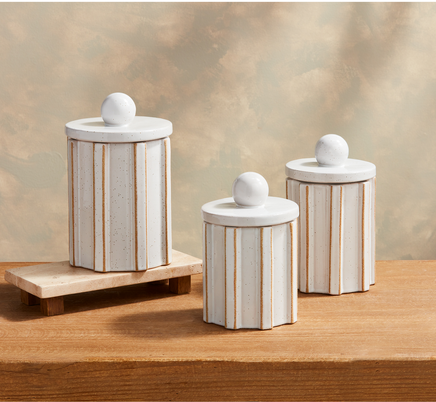 The Terracotta Canister Set comprises three exquisitely crafted canisters crafted from glazed stoneware. With their textured grooves, these canisters exude a stylish appeal. The lid, adorned with a ball-shaped handle, is equipped with a gasket to guarantee an airtight seal, ensuring the freshness and protection of your food items. Not only are these canisters highly functional, but they are also effortless to clean as they can be safely placed in the dishwasher. Moreover, they are microwave-safe, enabling you to conveniently warm up your stored food. Infused with the rustic allure of terracotta, these canisters effortlessly enhance the aesthetic of any kitchen decor.