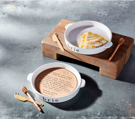 If cheese is the way to your heart, you'll love this Ceramic Brie Baker Set. The three piece set comes with a ceramic brie baking dish. The brie baking dish comes with a wood honey dipper and brass finished cheese knife. The baking dish comes with a baked brie recipe insert.