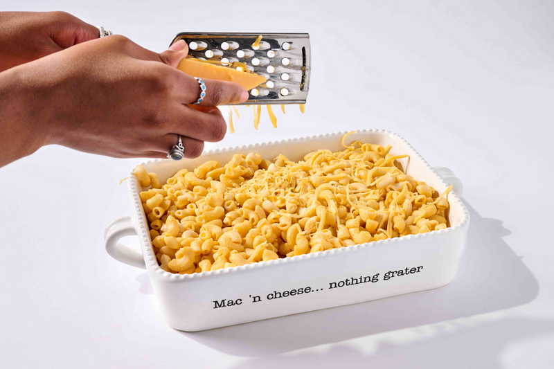 2-piece set. Ceramic mac and cheese baker with side handles arrives tied with silverplate sentiment cheese grater.