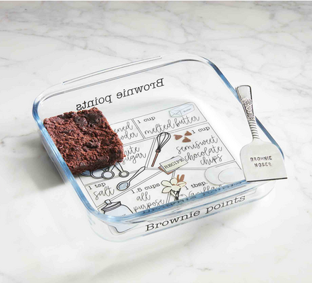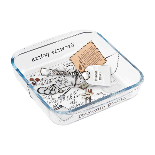 You'll earn total brownie points with this Brownie Recipe Baker Set. The two piece set comes with a glass brownie recipe guide baking dish. The dish features measurements and ingredients for a delicious brownie recipe. The dish also comes with a coordinating silver-plate spatula.