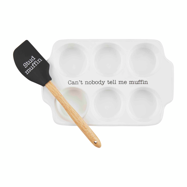 You can't tell me muffin when it comes to this Muffin Tray and Spatula Set. The two piece set comes with a ceramic muffin tray. The tray features the sentiment "can't nobody tell me muffin". The set also comes with a wood and silicone spatula. The spatula features the sentiment "stud muffin".