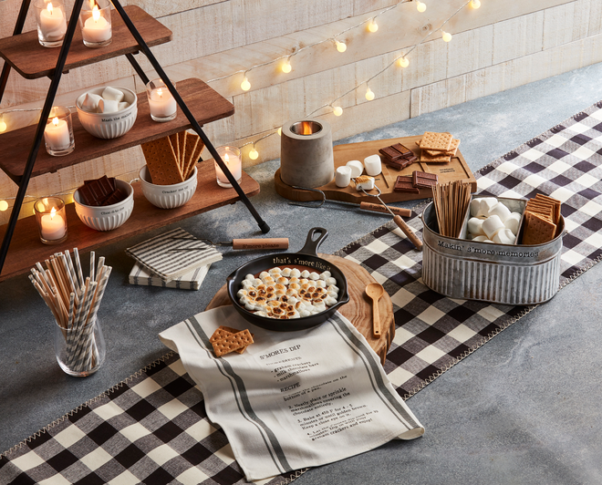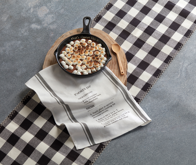 Whip up some s'mores dip with our S'more Dip Skillet Set. The three piece set comes with a stoneware skillet that reads "that's s'more like it". The skillet comes with an engraved wood spoon and cotton towel. The cotton towel features the recipe for a yummy S'mores Dip that you can make in this skillet. This makes a great gift! We love to pair with the ingredients - graham crackers, chocolate bars and marshmallows making it so easy to make after gifting!