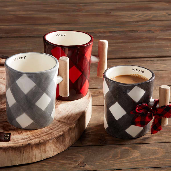 Get ready for warm and cozy nights in this winter with our black buffalo plaid oversized mug. The oversized ceramic mug features a driftwood handle. The coffee mug features a hand-painted design that showcases a black and white plaid pattern. The interior of the mug says "warm".