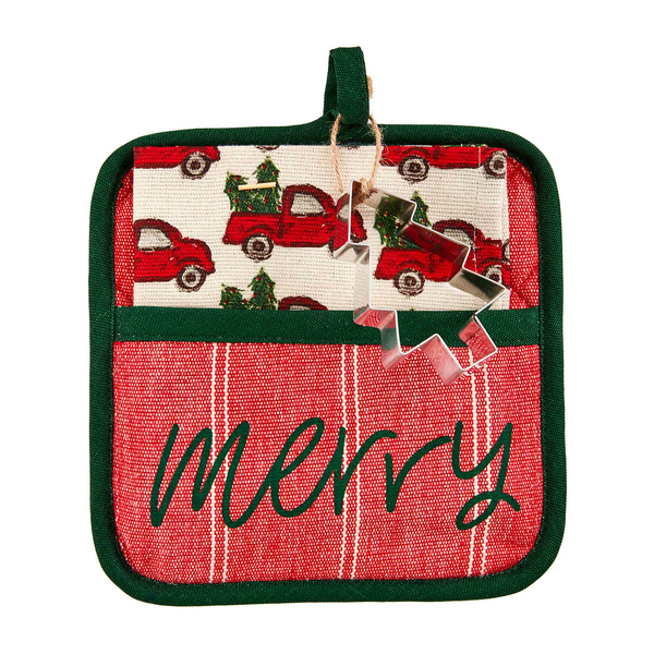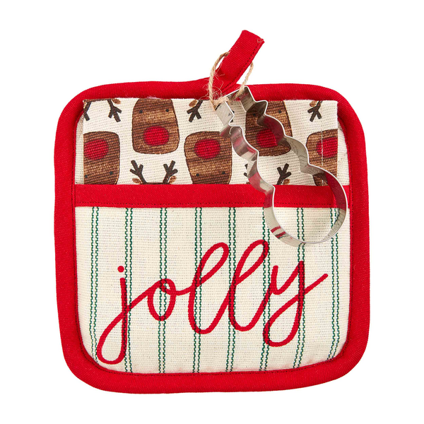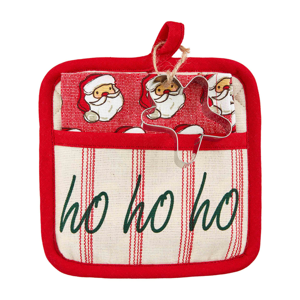 Add a festive flair to your kitchen with our Ho Ho Ho Pot Holder Set. This delightful set includes three essential pieces to make your holiday cooking a breeze. The set features a high-quality cotton pot holder, a soft and absorbent cotton hand towel, and a durable stainless cookie cutter. Crafted with care, the pot holder's shell is made of 100% Cotton, providing excellent heat resistance and protection. Its filling consists of 100% Polyester for added insulation. The included towel is also made of 100% Cotton, ensuring superior absorbency and durability. The pot holder measures 8" x 8", while the towel measures 12" x 12". Elevate your kitchen decor and embrace the holiday spirit with our Pot Holder Set.