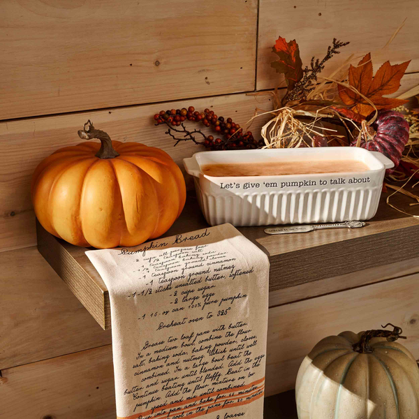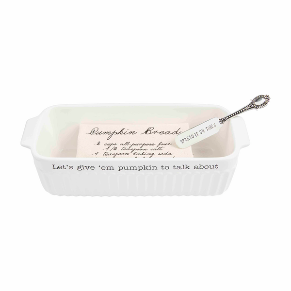 Let's give 'em pumpkin to talk about with our Pumpkin Bread Baker and Towel Set. The three piece set comes with a fluted ceramic baking dish. The dish comes with a stamped silver-plate spreader and cotton recipe towel for Pumpkin Bread. The dish reads "Let's give 'em pumpkin to talk about".