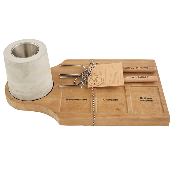 Our S'more Roasting Board set will have you asking for S'more please! The four piece set comes with a wooden board. The board holds s'more ingredients with places for marshmallows, chocolate and graham crackers. The set also comes with two metal and wood skewers that read "ooey & gooey" and "S'more please". Finally, we've included concrete mini fire pit. This is a great way to create an indoor campfire experience. The fire pit is fueled by isopropyl Alcohol. The fire pit comes with detailed use instructions. Concrete will have hairline cracks after using. Cracks do not get progressively worse or wider with each use.Adult supervision required.