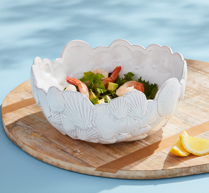The Layered Sea Shell Bowl is an exquisite creation crafted from milk glazed terracotta. Its captivating design showcases numerous layers of sea shells delicately embedded into the terracotta, resulting in a mesmerizing and intricate pattern. The rustic and earthy texture of the terracotta material harmonizes beautifully with the touch of elegance provided by the milk glaze. Whether it is used for serving snacks, fruits, or simply displayed as a decorative piece, this bowl effortlessly enhances any space with its versatile design and natural color. A must-have addition to elevate your home decor.