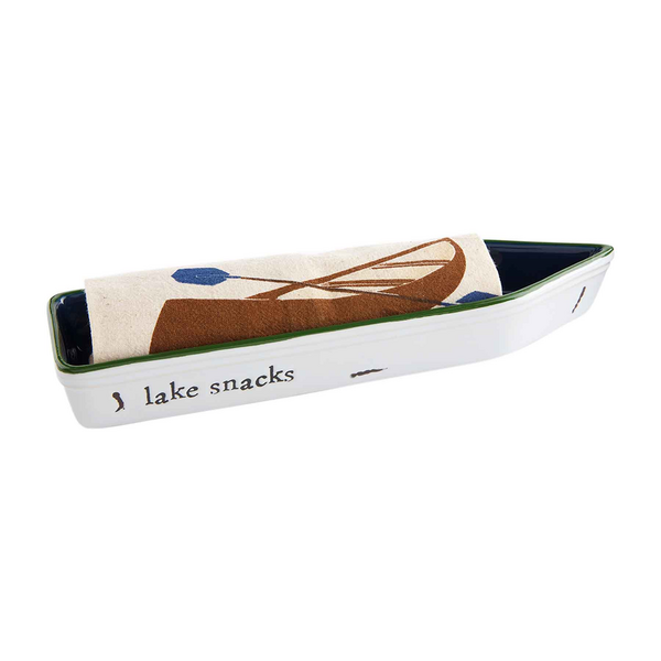 Soak up the sun with lake snacks in our Lake Life Cracker Dish Set. The two piece set comes with a hand-painted stoneware boat shaped cracker dish. The dish features a debossed "stamp" detail that reads "lake life". The dish comes with a flour sack hand towel that reads "gone fishin".